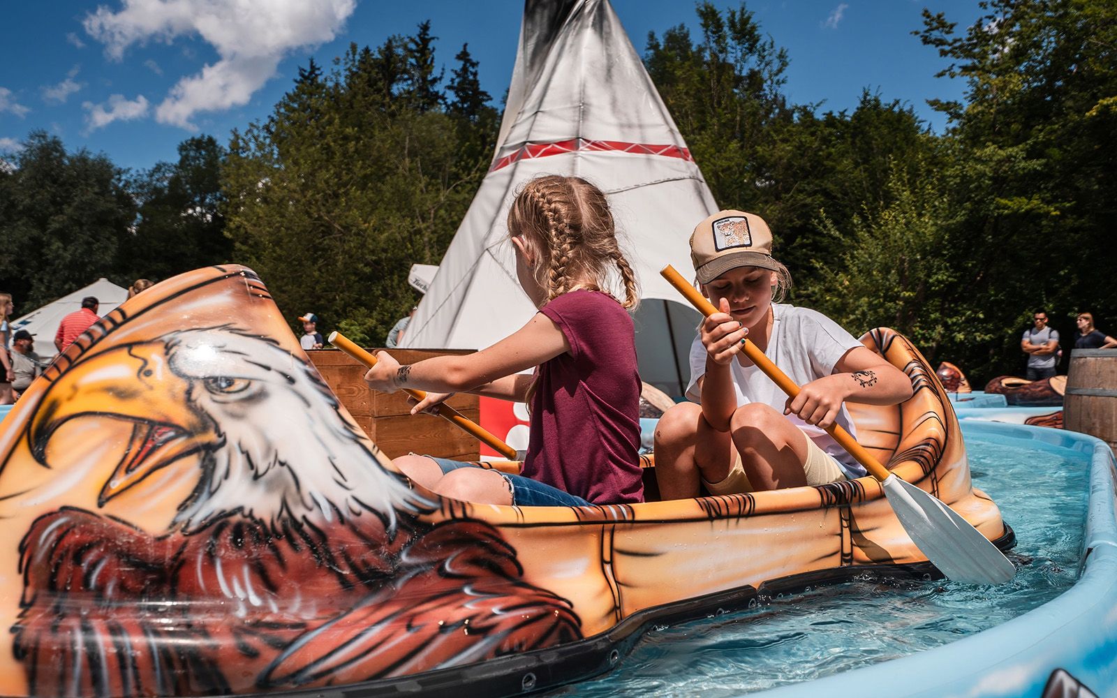 Perfekte Voraussetzungen für einen Familienurlaub: Der GlampingPark verfügt über einen eigenen Zugang zum Freizeitpark mit vielfältigen Fahrgeschäften und Liveshows. Alle Attraktionen sind so bequem ganztägig erreichbar, und die Gastronomie in der Westernstadt verlängert ihre Öffnungszeiten speziell für Gäste des GlampingParks. Zusätzlich ist ein besonderes Familienprogramm mit Aktivitäten für Groß und Klein in Planung für die Saison 2026.