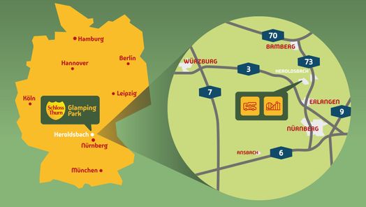Durch seine zentrale Lage an einer der wichtigsten Nord-Süd-Achsen (A3/A73) Deutschlands bietet der GlampingPark Schloss Thurn mobilen Reisenden eine komfortable Übernachtungsmöglichkeit. Die großzügigen Stellplätze (70 bis 120 Quadratmeter) verfügen über Stromanschluss und WLAN. Gäste finden private Sanitäranlagen vor und die Umgebung ist hundefreundlich. Ein Hüpfkissen sowie die vielfältigen Freizeitmöglichkeiten runden das Angebot ab. Wer es besonders luxuriös mag, mietet eine der sieben auf Stelzen gebauten Glamping-Lodges mit eigenen Betten und eigenen Toiletten.